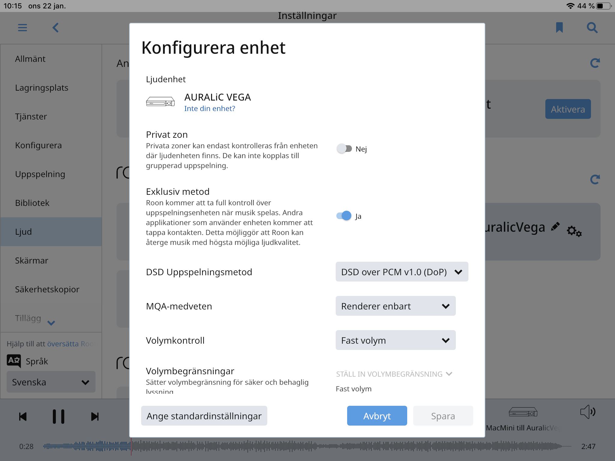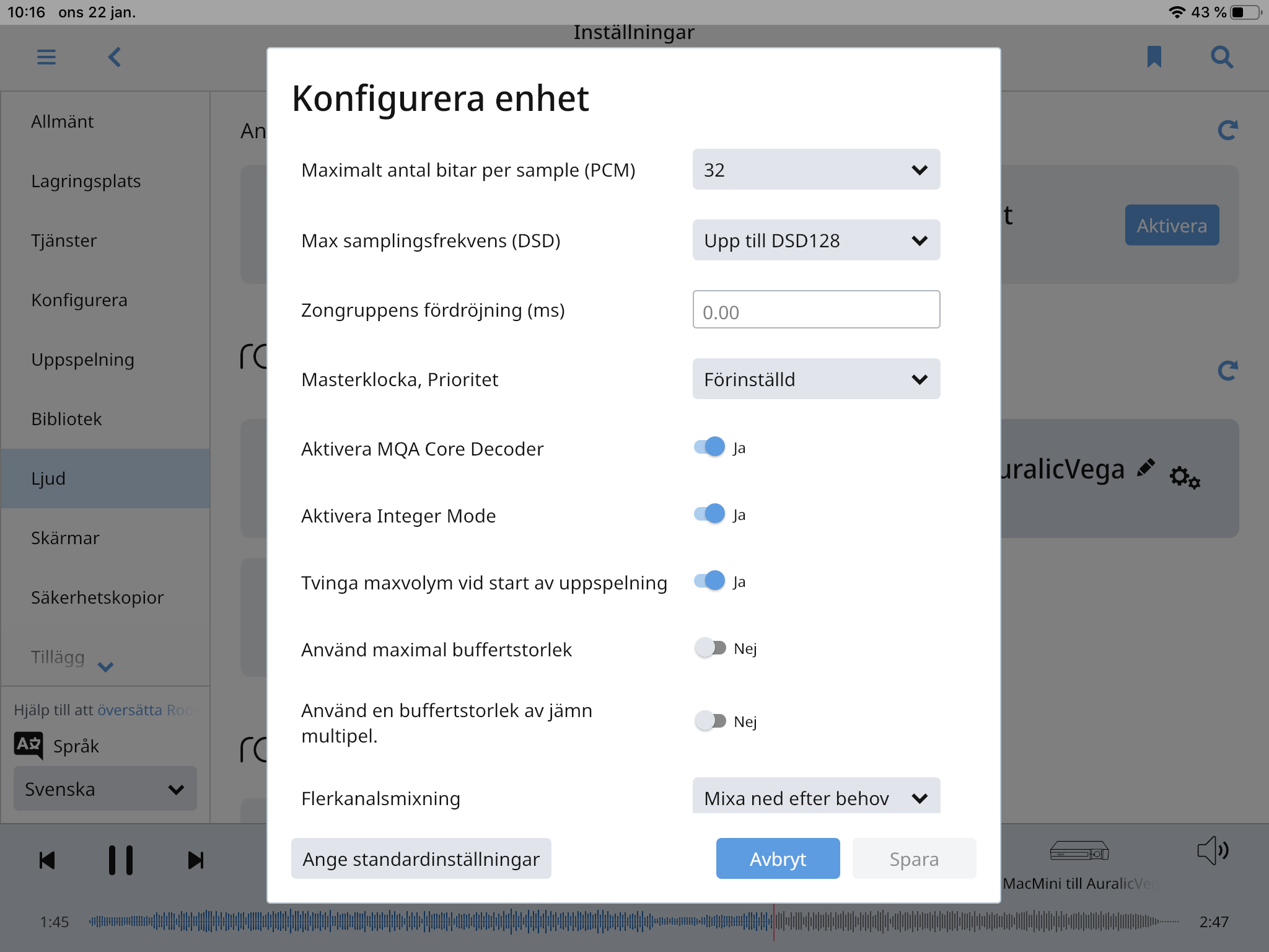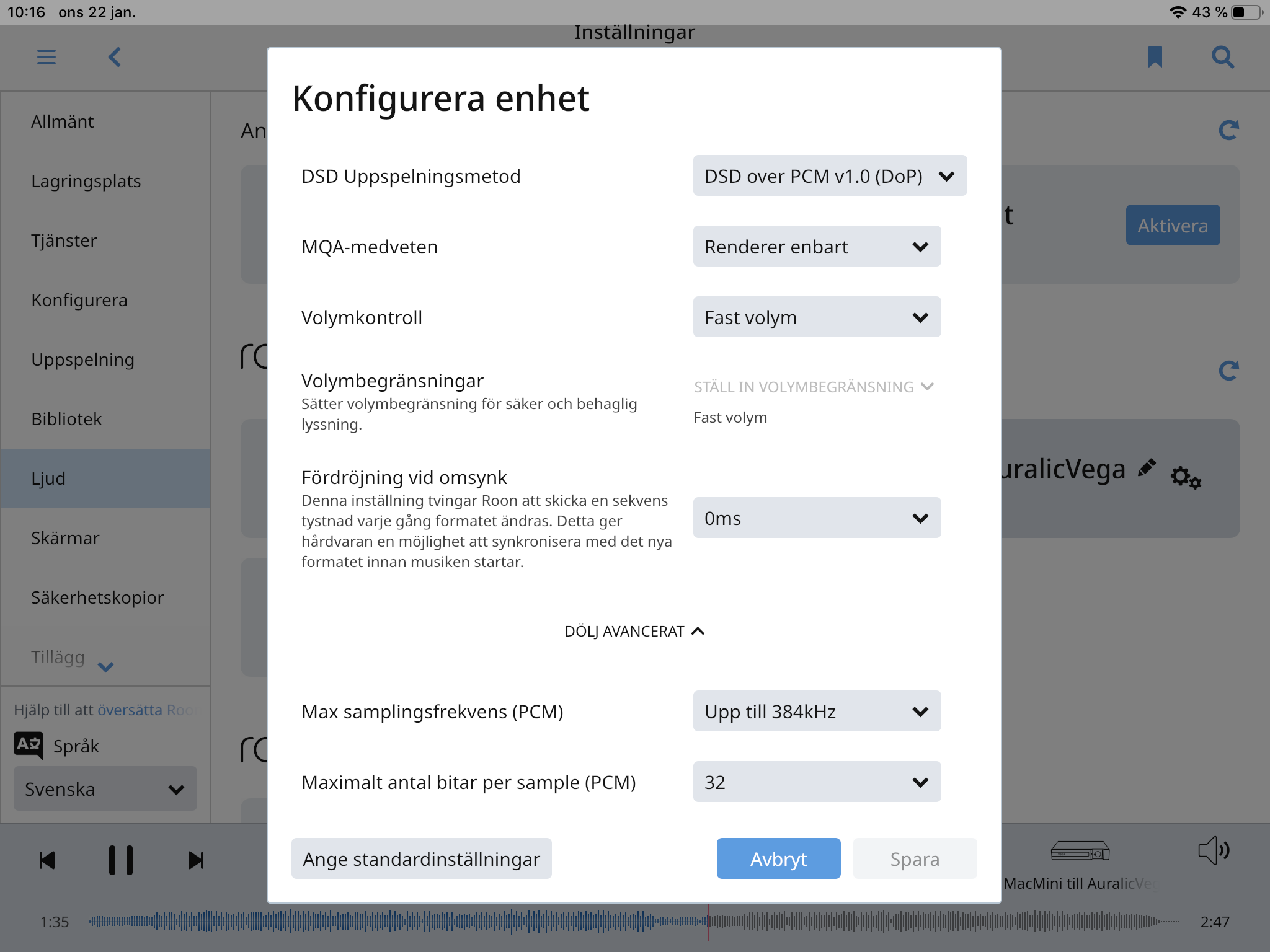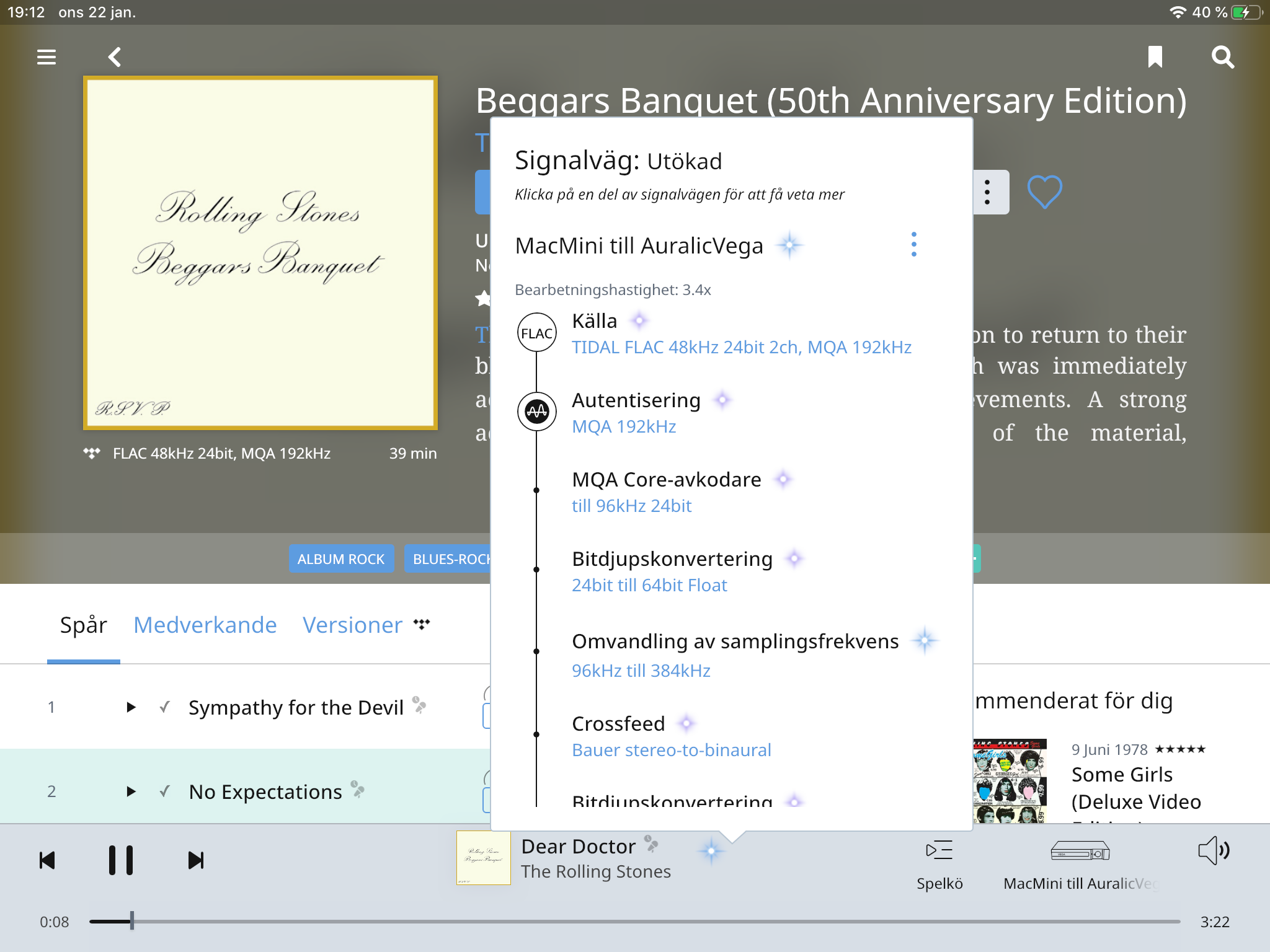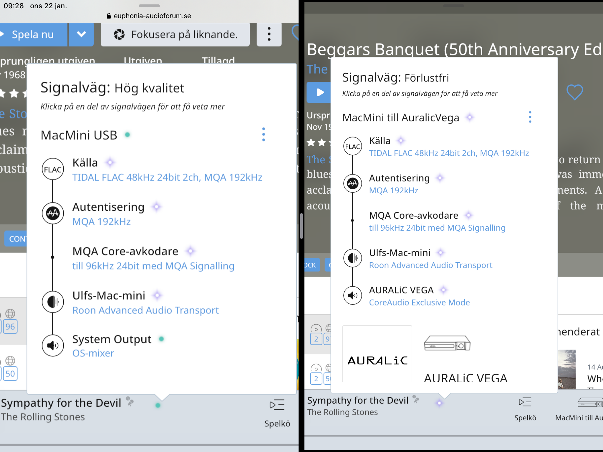 ulfsan Posted January 22, 2020 Author Posted January 22, 2020 (edited) Uj,uj, uj så det blev med DSP aktiverat. Annas iMac har också en Intel Core2Duo från 2009 på 3,06 GHz. Vega DAC visar 384KS i displayen och i Roon får kedjan inte plats att visas om man inte scrollar. Vi får se om iMac orkar med denna inställning. För att hjälpa till lite har jag kopplat en ethernetkabel (utöver wifi) mellan iMac och MacMini. / Edited January 22, 2020 by ulfsan Quote