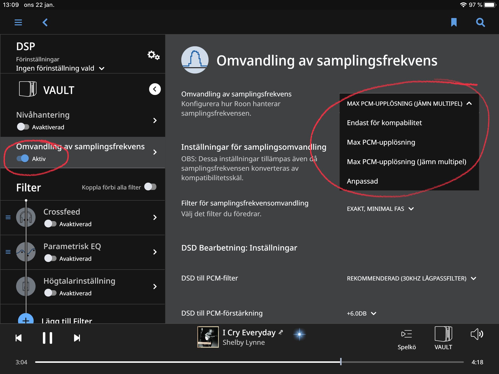 AlfaGTV Posted January 22, 2020 Posted January 22, 2020 (edited) Nu snackar vi! Fast byt från "Renderer enbart" till "Stödjer ej MQA"! Detta har blivit default av okänd anledning i Roon sedan någon nylig uppdatering. Annars ser det helt rätt ut, och du behöver inte pilla med MIDI settings för att omsampla i din Bridge. I din post #24, på den högra bilden, så klickar du på de tre prickarna till höger om "MacMini till Auralic Vega" och där kan du välja DSP. DSP-dialogen ser ut så här, och jag har expanderat uppsamplingsmöjligheterna: Här kan man pilla lite och experimenter med filter, format och lite annat smått o gott! Tillräckligt mycket parametrar för att hålla en entusiast sysselsatt länge och väl! Edit: Inser att jag valde min Vault som exempel, vilket innebär att DSD-alternativen inte syns för mig, men kommer visas i ditt fall. Glöm inte sätta parametern "Parallellisera Sigma-Delta modulator" och gärna "Aktivera naturlig DSD-bearbetning" om din iMac tål detta. Edited January 22, 2020 by AlfaGTV ulfsan 1 Quote