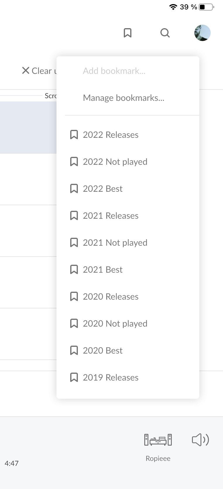 shifts Posted March 14, 2022 Posted March 14, 2022 (edited) Kikade på de existerande Roon-trådarna och tyckte efter att ha sett dem att det saknas en om hur vi Roon-användare på forumet faktiskt använder programvaran i vår lyssning hemma. Det finns inget rätt och fel i tråden, men har en önskan om att det ska handla mer om hur man handgripligen konfigurerar, filtrerar, ändrar metadata, lyssningsvanor med avstamp i Roon, snarare än något som relaterar mer till hårdvaran. När jag kom på trådidén var jag främst nyfiken på hur ni andra bygger era bokmärken/filter eller om ni alls gör det, men breddar gärna trådämnet för att förhoppningsvis hålla tråden vid liv och kanske kan den med tiden bli ett bibliotek med tips om hur man använder Roon effektivt. Det är ju tack vare forumet jag faktiskt har Roon samt en NUC med ROCK installerat, plus en Raspberry Pi 3B på det och är fortsätt mycket nöjd med lösningen. De olika iterationerna av Roon som kommer ger och tar, men för det mesta ger det mer än det tar och därmed har jag inte heller någon plan på att byta än. InnuOS är de som kommit närmast med att erbjuda ett alternativ, men än så länge saknar deras operativ för mig viktiga funktioner. ---------- Lyssnar mycket på nyutkommet material och för att ha lite koll på vad jag uppskattar bygger jag upp olika bokmärken för detta. Minnet är allt för kort för att hålla sådant i huvudet, samt det underlättar med att återupptäcka favoriter från de gångna åren. Är mycket förtjust i årsbästalistor och då är detta ovärderligt: 1) Filtrerar ut årtal, betyg, spelad/ospelad, osv. 2) Filter baserat på skivbolag + ospelat. 3) Några filter på mp3 för att ha koll på gamla synder som successivt byts ut. Jag använder gärna bokmärken istället för att använda fokus-funktionen on-the-fly, då jag gärna vill ha direktaccess till dem. Nu börjar jag få rätt många bokmärken och önskar nästan det fanns en ordentlig egen vy för detta, istället för endast en dropdownmeny. Finns så sanslöst mycket funktioner i Roon jag överhuvudtaget inte befattat mig med, som de olika rumsjusteringar man kan göra exempelvis, men det får väl bli om ytterligare några år. Om någon leker med den biten vore det förstås intressant att se i tråden. Edited March 14, 2022 by shifts Edit: Ett av filtren här är fel ser jag nu och visar ospelat material från 2021 och framåt. ulfsan, new order and Daniel 2 1 Quote
