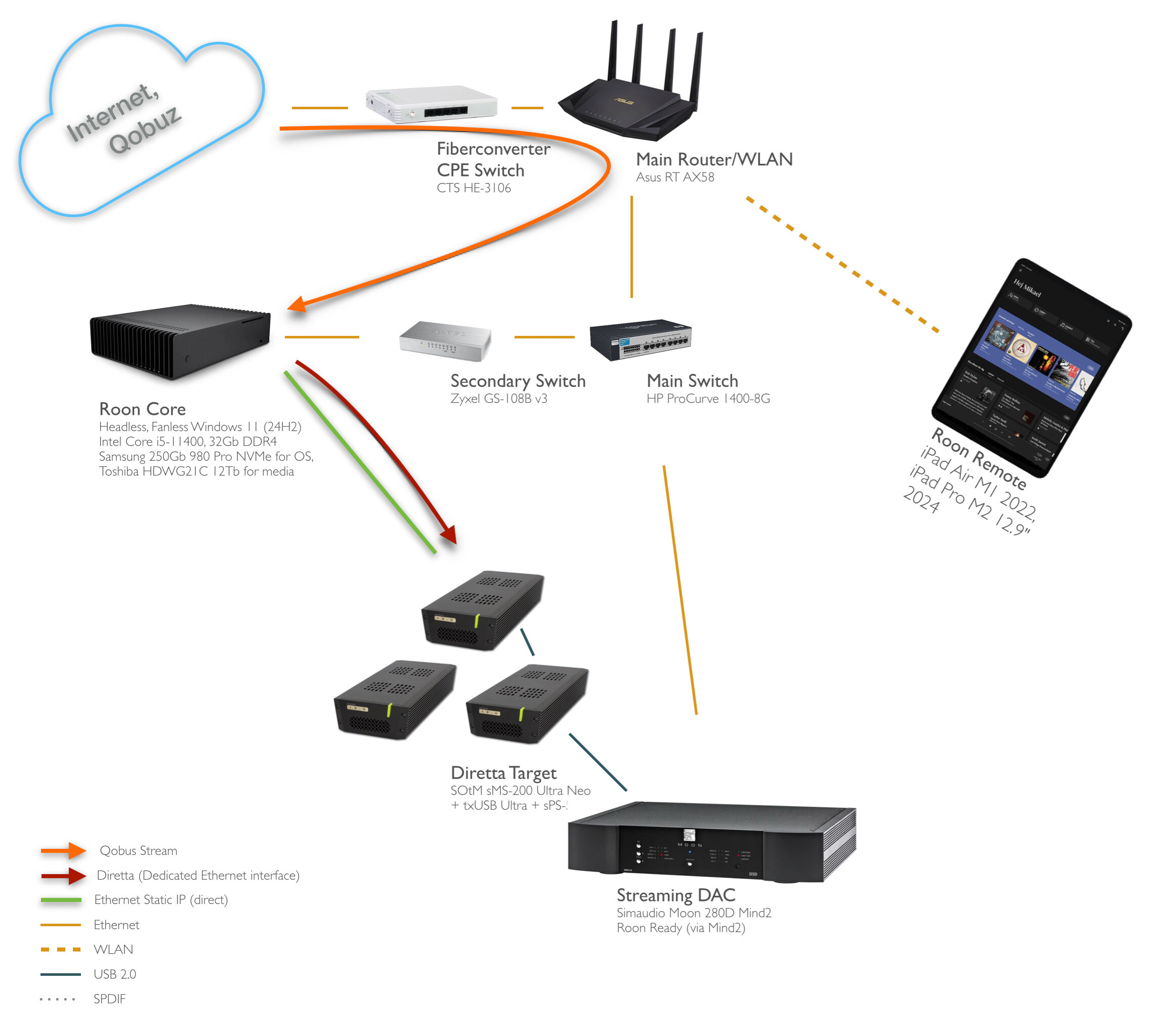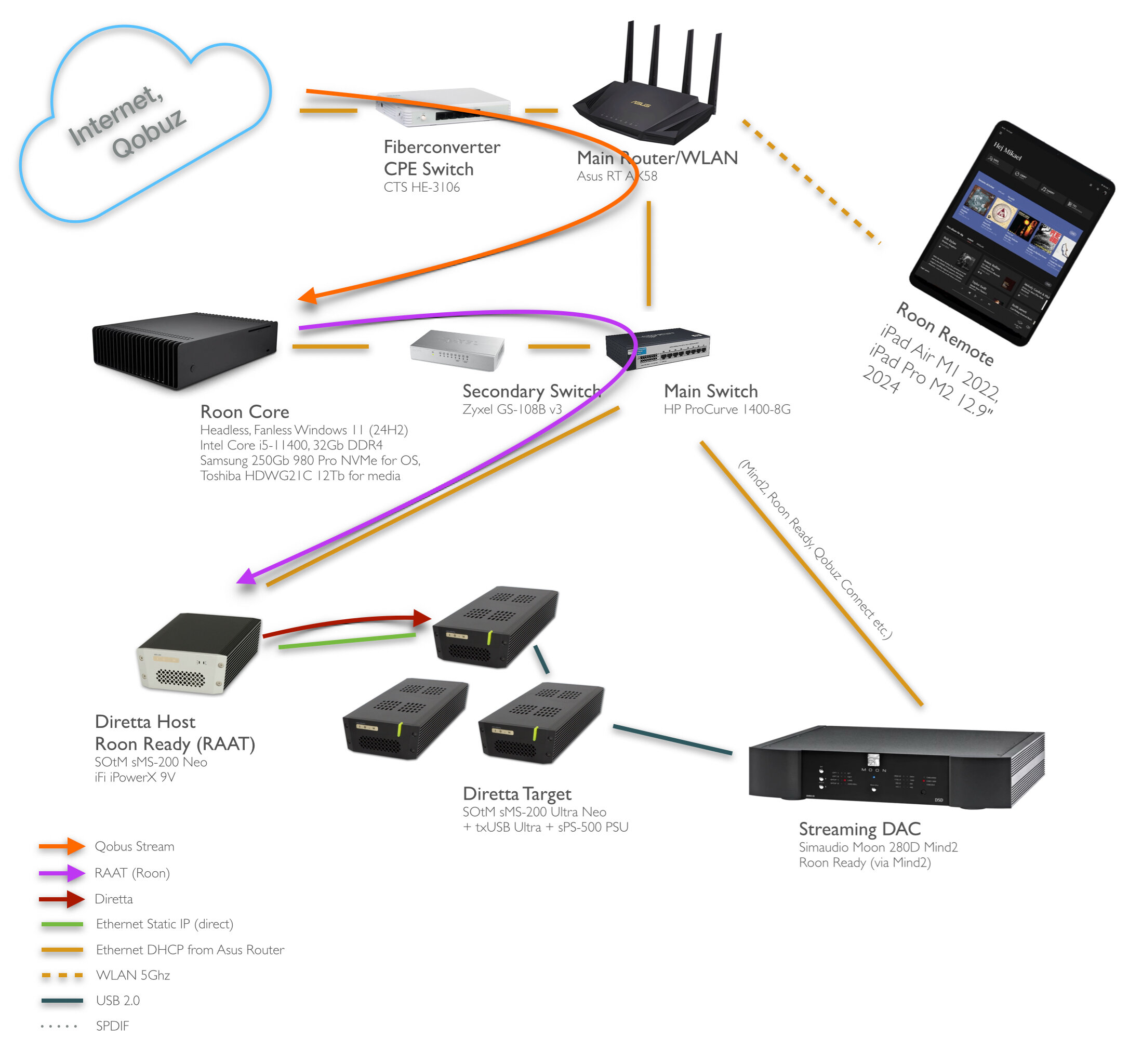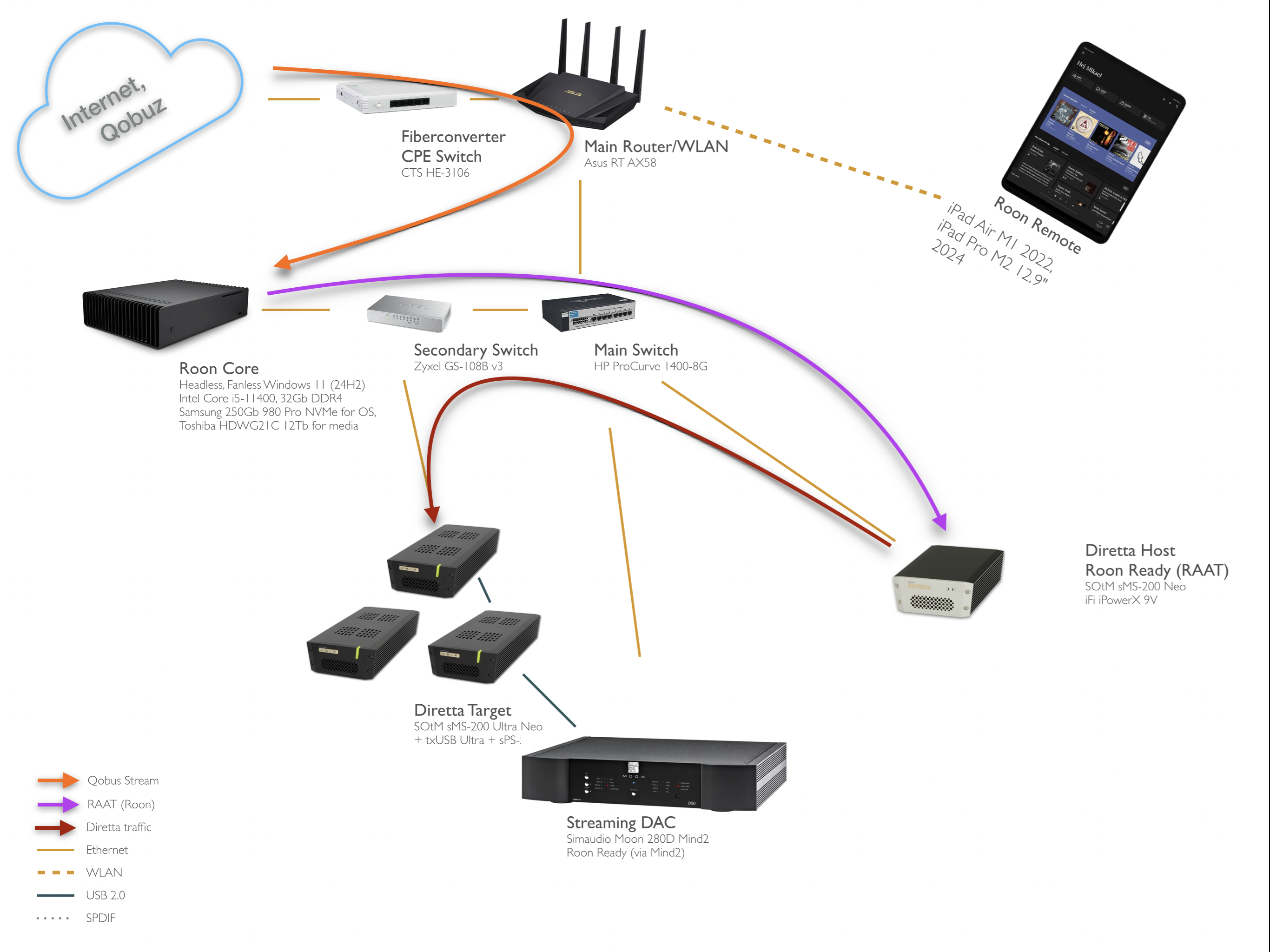 AlfaGTV Posted July 15, 2025 Author Posted July 15, 2025 Okej, nästa steg taget, att isolera Diretta-trafiken fullständigt. Det gjordes genom att koppla en USB->Ethernet dongel till SOtM sMS-200 Neo, till en av de generiska USB-portarna och samtidigt ställa de vanliga nätverksinterfejsen till "statiska" och ge dem fasta IP (ur en annan serie än den ditt nätverk vanligen erbjuder). En halvmeters skärmad kabel med en korskopplingsadapter (oskärmad) i Ultra-änden kompletterar setupen! "Fyra små grisar" 🐽 är de alltså numera! Från vänster: sMS-200 Neo - Roon Ready samt Diretta Host med dubbla nätverksinterface, iFi iPowerX 9v txUSB Ultra - USB omklockare med galvanisk avskiljning, inkommande kabel är AQ Carbon, till DAC sitter en Bertram The Wave Reference sMS-200 Ultra Neo - Diretta Target, ej nåbar via nätverket med statisk ip utanför vanliga intervallet. sPS-500 - Strömförsörjning till de båda svarta till vänster, 12V. Så, justerad översikt: Ja jäklars! Det här är förvånansvärt omvälvande! Och, jag håller på att titta på en RaspberryPi-baserad variant, som ju blir betydligt lättsammare på plånkan! Fatii, calle_jr, lindvall and 1 other 4 Quote
