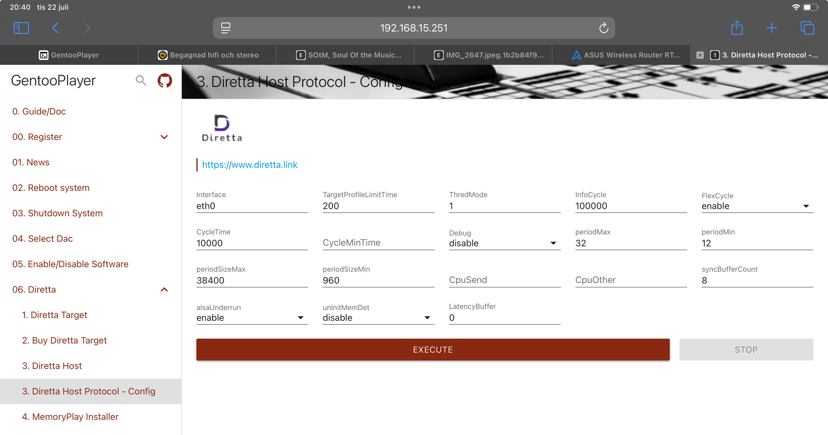 AlfaGTV Posted July 22, 2025 Author Posted July 22, 2025 On 2025-07-15 at 14:50, AlfaGTV said: Och, jag håller på att titta på en RaspberryPi-baserad variant, som ju blir betydligt lättsammare på plånkan! Jag har nu kört med en generisk Raspberry Pi4B som Diretta Host i denna konfig. Istället för den silverfärgade SOtM sMS-200 Neo så nyttjades en Raspberry Pi4B med GentooPlayer i trial-läge. GentooPlayer kostar €69 att licensiera permanent, och det bygger på en webbaserad script-konfiguration. Jag har en ethernet-dongel ansluten till USB: Den hanterar Host'ens kommunikation med omvärlden, och en korskopplad ethernet patch sitter mellan Pi4Bs standard ethernet och SOtM sMS-200 Ultra Neo. De senare gränssnitten är statiska, och befinner sig på ett annat nätverk än mitt vanliga, dvs de är isolerade från omvärlden. Det hade ju varit lök på laxen om det här hade låtit lika bra, men tyvärr måste jag säga att det inte upplevs lika välljudande som med SOtM sMS-200 Neo som Diretta Host. Det låter dock inte illa, utan upplevs som ett steg framåt jmf med den traditionella Roon Ready-funktionen. Det är tillräckligt bra för att ge den här tredelade server-transporten ett lyft, och det kostar inget att prova. PM:a mig så ska jag beskriva och hänvisa till hur man får igång GentooPlayer. Men, jag har även fått det enkla nätverkskort jag väljer att prova den förenklade Diretta-konfigurationen med! Återkommer med fler sagor från det digitala landet! Quote