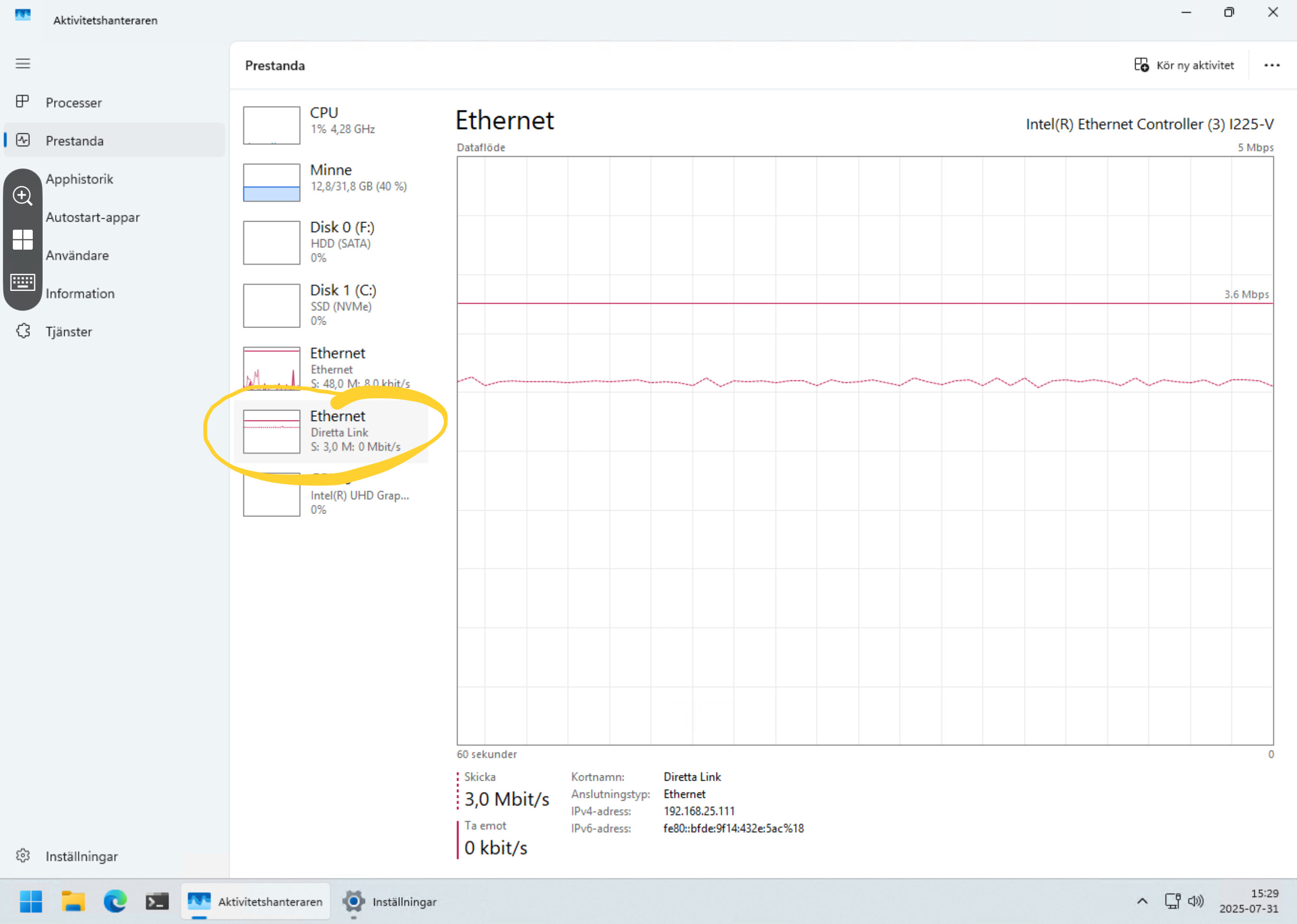 AlfaGTV Posted July 31, 2025 Author Posted July 31, 2025 On 2025-07-17 at 20:14, AlfaGTV said: Jag har även en enklare lösning kvar att testa, och det är att direktansluta Diretta Target med en ethernetkabel från ett eget nätverkskort internt i servern. Kan det vara den enklaste lösningen med mest pang för komplexitet och pengar? Då rullar den lösning som beskrivs i schemat! Vad jag har gjort är att gå tillbaka till det första testet, dvs. att låta SOtM's ASIO->Diretta-drivrutin agera utenhet. Den utgör ett virtuellt ljudkort på servern, som skickar ut den digitala ljudsignalen via ett ethernet-gränssnitt. Mitt första test utnyttjade min servers inbyggda ethernet-gränssnitt, alltså delades nätverket med allt annat irrelevant. Skillnaden nu är att jag monterat ett separat nätverkskort, som enbart används för Diretta, med fast IP, och inga broadcasts, och i detta fall kopplas direkt (inte ens korsad kabel) till SOtM sMS-200 Ultra Neo's ethernetgränssnitt. Trafiken med 24Bit PCM44.1 ser ut så här på gränssnittet: Den spontana upplevelsen är att det är i praktiken lika bra som med sMS-200Neo som separat Diretta Host, men en mer kostnadseffektiv lösning. Jag är mycket nöjd med denna setup! Nätverkskortet är ett enkelt PCIe från Amazon.se, med Intels I225V chipset, ett 2.5Gbps gränssnitt som på begäran av sMS-200Ultra Neo förhandlas till 100Mbit. Anpassningar i övrigt på SOtM-sidan är en klockfrekvens på 312Mhz, men i övrigt standard. Nu har jag bara en PCIe "riser", så jag fick koppla bort USB-kortet i servern temporärt, men får välan skaffa en till. Terminator and Richard 2 Quote