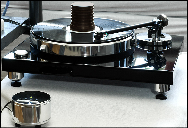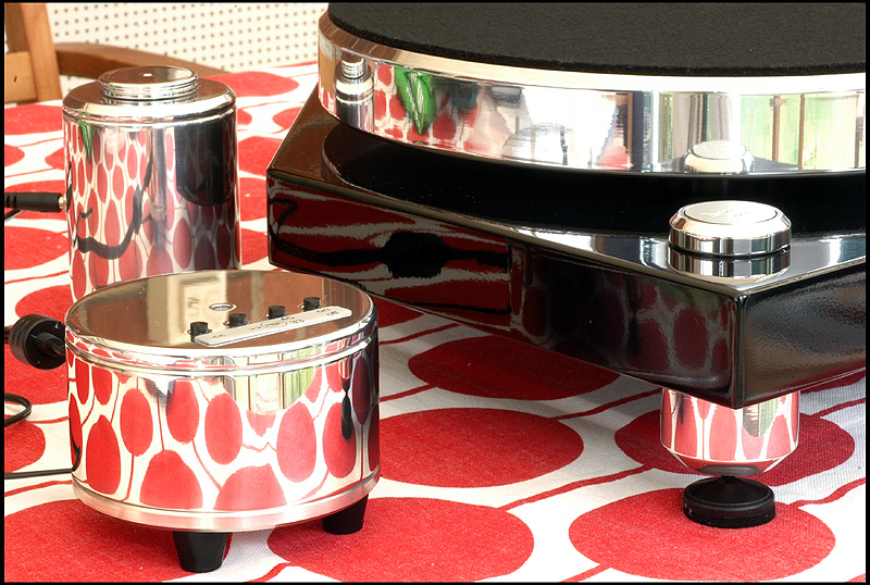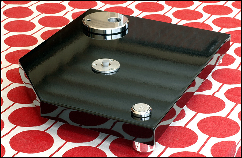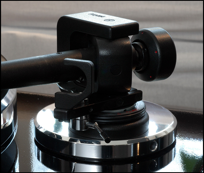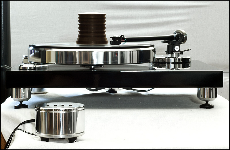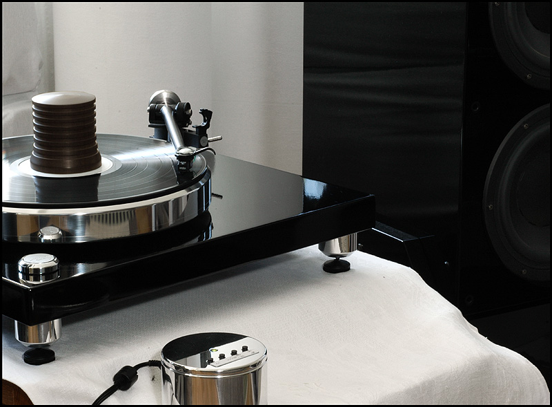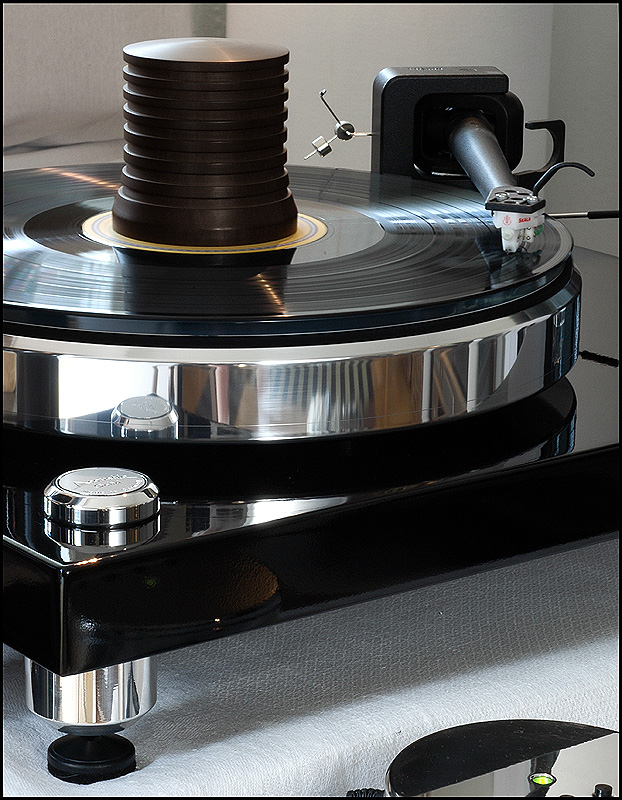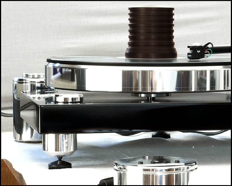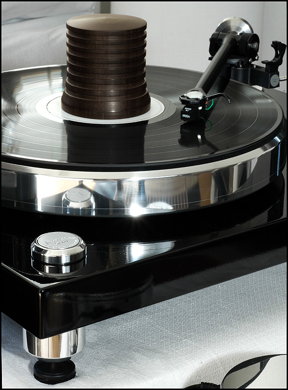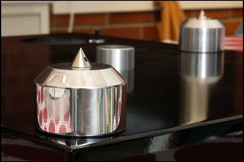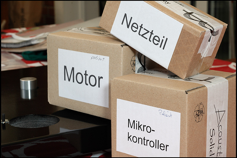 calle_jr Posted August 15, 2008 Author Posted August 15, 2008 Montering och egenskaper Den tjocka kartonglådan var ovanligt väl packad. Varje delkomponent fanns i en egen märkt låda, och allt var väl skyddat för att minimera skador åsamkade av glada truckförare. Plinten av 39mm svartlackerad HDF-platta har tre fastmonterade fötter med spikes och en solid tonarmsplatta för 9"-arm med 30mm tonarmsaxel (Rega). Det sitter tre spikes med genomgående hål för nivåjustering. Skivtallriken är en 35mm massiv aluminiumtallrik med en (löstagbar) 4mm nålfiltsmatta som läggs mellan aluminiumtallrik och en likaledes lös 6mm plexiglasplatta. Lagret är av traditionell typ med lagerhylsa i plinten och lageraxel nedstickande från tallriken, med en lagerkula av keramiskt material. Lagerhylsan är inpressad i drivverket, och lageraxeln har fin passning. Efter 10 droppar olja i hylsan tog det en stund för den att komma på plats, och allt är alltså i sin ordning. Motorn är en synkron växelströmsmotor som sitter i ett tungt, separat hus som drivs av den microchipstyrda nätdelen. Motorstyrningen är suverän, med en röd lampa för 45, en grön för 33vpm och blinkande röd/grön tills rätt hastighet är uppnådd. Om det skulle uppstå ett spänningsfel, så blinkar den ett par sekunder och stängs därefter av. I motorstyrningen sitter det ett microchip för styrning och justering av varvtal. Den medföljande remmen är en elastisk nylonlina, och jag känner genast lust att testa olika lintyper. De lintyper man använder i modernt sportfiske har helt andra egenskaper och det vore intressant att se hur en helt stum kolfiberlina påverkar drivningen. Det spårade drivhjulet är avpassat i höjd för att driva nära underkanten av tallriken. Vad gäller slutfinish på konstruktionsdelarna är den mycket bra, och alla delar i verket känns gedigna när man tar i dem. Om man går riktigt nära inpå är det inte schweizisk klockfinish, och i makroläge syns det små egenheter. Men detta är inget som stör eller syns för envar som inte sätter näsan till kromen. Jag har upplevt betydligt dyrare drivverk som inte är ens i närheten av den finish och kvalitetskänsla som återfinns på Acoustic Solid Classic Wood Black. Måtten är som för en traditionell spelare med BxD: 470x370mm och den väger totalt ca 20kg.