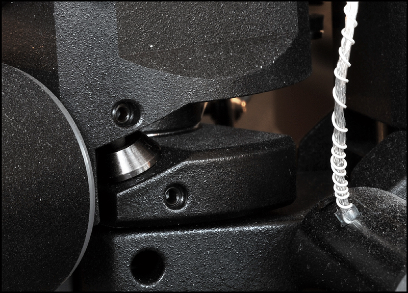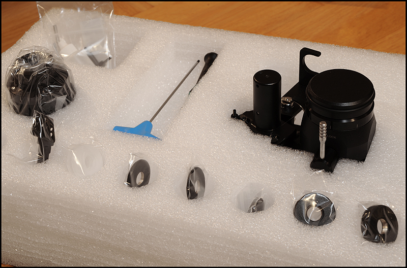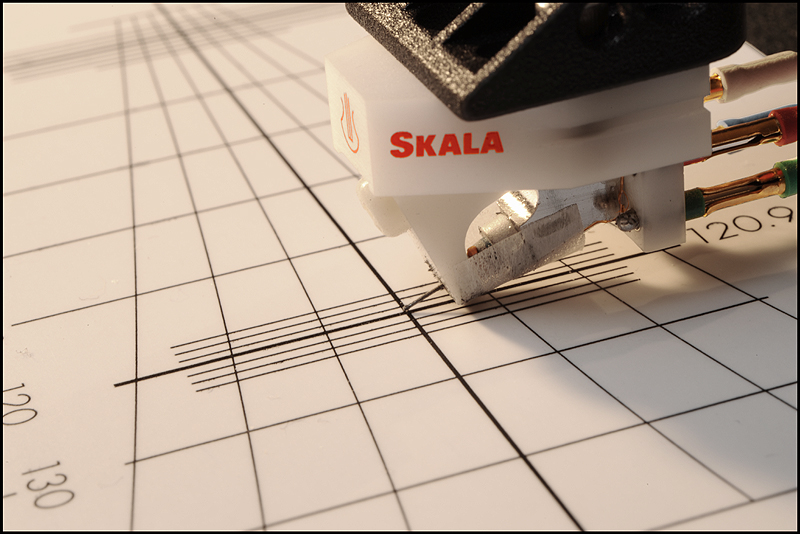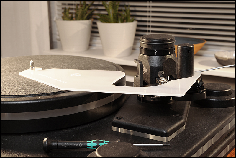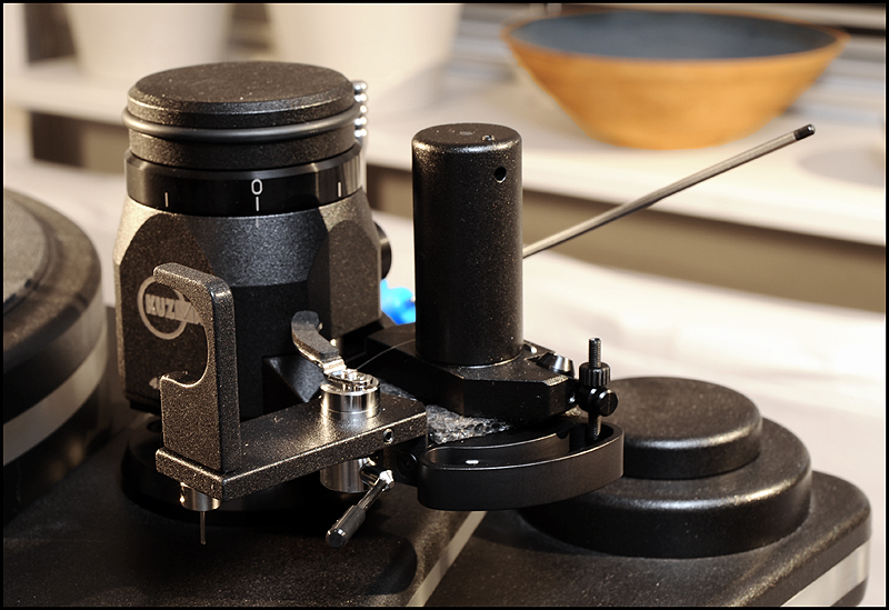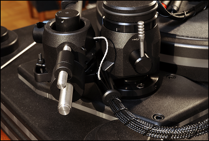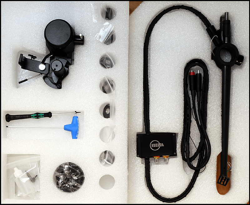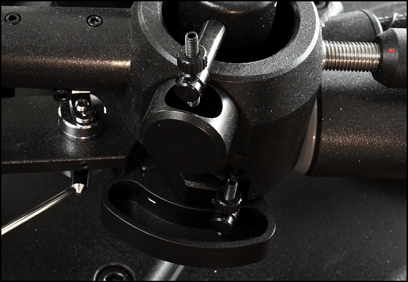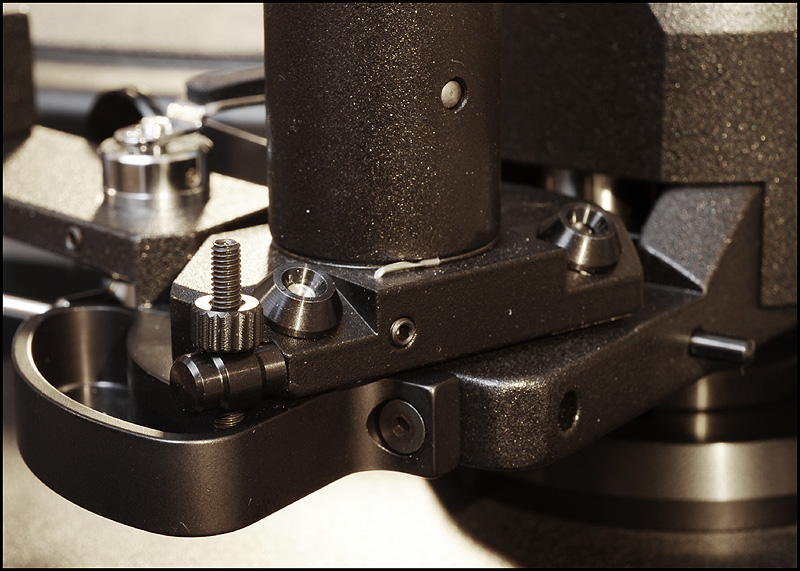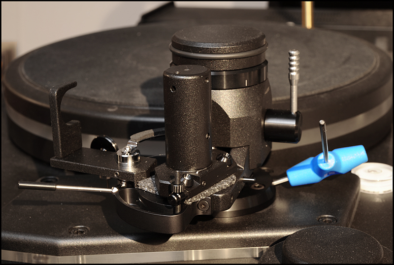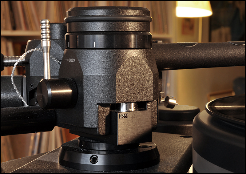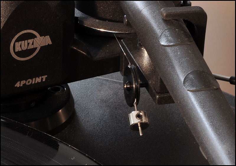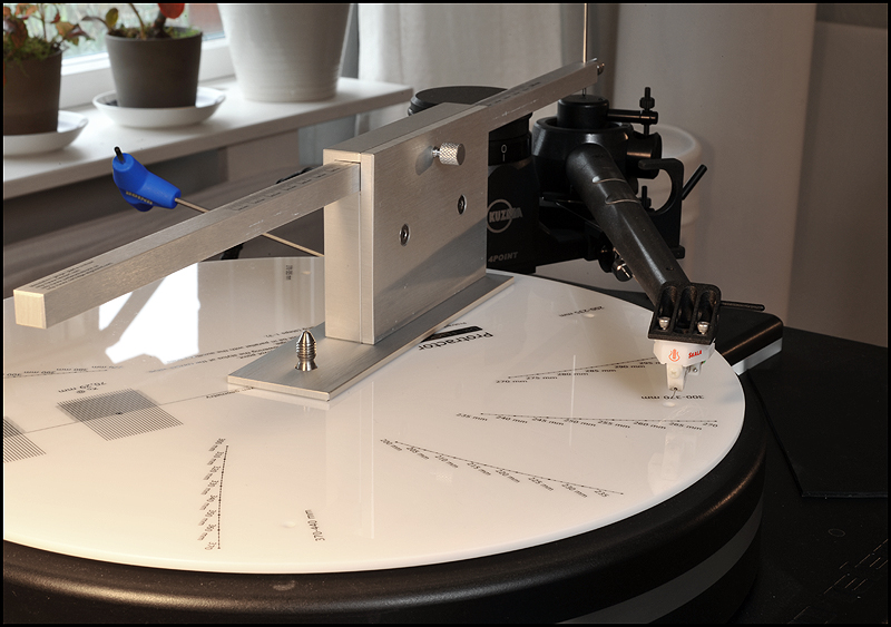 calle_jr Posted December 31, 2008 Author Posted December 31, 2008 Montage och konstruktionsprinciper För att ge pickupen minimal friktion och vibration har den utformats som en 4-punktslagrad konstruktion. Två lagringspunkter medger vertikal rörelse och två horisontell. Vertikal lagring fungerar som en knivsegg varpå tonarmen balanserar. Denna lagringstyp kallas dubbel unipivot och återfinns även i en del andra tonarmar. Men det är den horisontella lagringen som satt uppfinningsrikedomen på prov. För 10 år sedan formulerade Kuzma de grundläggande teoretiska idéerna som baserades på att använda endast en del av ett varv för horisontell rörelse. För 6-7 år sedan inleddes praktiska försök med en enkel prototyp, som dock under två års tid kom i skymundan pga utvecklingen av tangentialarmen Air Line. När Air Line var klar återupptogs arbetet med en mer seriös prototyp som gick under arbetsnamnet Stogi Q. Redan inledningsvis lät prototypen lovande, och Kuzma insåg potentialen av längre armar även i sitt eget sortiment. Det tog tre år att optimera och finslipa vinklar, rotationspunkter, kraftspel och alla detaljer i 4Point. Vi fick därefter vänta ytterligare ett år innan de första armarna kom i produktion. 4Point är 11" men passar Kuzmas standardmontering för 9" (monteringsavstånd 212mm). Effektiv massa är 13g, effektiv längd 280mm och överhäng 17mm. Armen kan alltså monteras på de flesta spelare (av Linn-typ), bara upphängningsjusteringen i drivverket klarar en vikt av 1.7kg. Montaget kan verka avskräckande på en del med den stora mängden delar, men är absolut ingen match och blir ännu lättare med den pedagogiska manualen till hands. Transportkartongen är nästan missvisande – man skulle gissa att den innehåller en hel skivspelare. 4Point kommer med manual, olika protractors, verktyg, extra pickupskal, extravikter och olja. Hålet i kragen för tonarmsbasen är 40mm i diameter till skillnad från Linn-standardens 30mm. Det robusta VTA-tornet monteras i armbasen och fixeras med en insexskruv så att nivån på plattan som håller armlyften är i nivå med LP-skivan. Här visas så mycket som går att visa av de horisontella lagren, som sitter dolda inne i den upp-och-ned-vända cylindern (lagerhuset). Här möjliggörs helt fri rotation ca 90 grader kring tonarmsaxeln, förutom den mothållande kraft man önskar i form av antiskating och eventuell dämpning i oljebad. Funktionen hos de fyra lagerpunkterna är densamma som i en gimbalupphängning, men konstruktionen är väsentligt annorlunda. Tornet lösgörs med en insexskruv och en protractor används för att få exakt 264mm mellan spindel- och armlagerpunkt. Därefter monteras armen med två spikes i kopparna på tonarmsplattan. Se närbild av kopparna till de vertikala lagren och i samma bild syns infästningen av antiskatinglinan. Lagren sitter något vinklade och när armen placeras med spikes i kopparna ser det ut så här: Tonarmskabeln sitter säkrad i tonarmen när den transporteras eller på- och avmonteras. Säkringsanordningen lösgörs och fästs i stället på tonarmsplattan som är förbunden med VTA-tornet. Med denna lösning blir konstruktionen robust och transportsäker, utan att tonarmens lager påverkas av kabelns vikt. Kablaget är en silverlegering som standard. Ett set kablar fästs med Cardas-clips i pickup-kontakterna, och löper obrutet därifrån till en termineringsbox och vidare med en 1.4m kabel som terminerats med silver bullet plugs från Eichman. Ytterligare ett set kablar löper från samma Cardas-clips till termineringsboxen där de terminerats med Cardas RCA-kontakter. Man kan alltså ha två par tonarmskablar inkopplade. Andra kabeltyper kan väljas, inklusive Nordost. Dock måste Nordostkablage utföras som singlewire utan termineringsbox, eftersom Nordost är för kraftig att utföras som biwire. Om dubbla kablage ansluts till riaa skall man observera att pickupen kommer se detta som en halv last. Riaat måste i dessa fall ställas in med dubbel last. Armröret är tillverkat från solid aluminium, precis som övriga tonarmar från Kuzma. Pickup-skalet är avtagbart och har en hexagonal låsmekanism som fästs med en insexskruv till armröret. Den främre delen av armröret är vridbart så att azimuth kan justeras i små steg med en liten insexnyckel. Som syns är offset-vinkeln (19.5 grader) förlagd till pickup-skalet. Det går utmärkt att använda den medföljande protractorn för pickupinställning. Det sitter två motvikter på 4Point. Den större balanserar tonarmen på samma sätt som en vanlig motvikt, och den mindre används för finjustering av nålvikt. Tonarmen kan bara balanseras på ett ungefär eftersom tyngdpunkten ligger i höjd med de vertikala lagren och mycket lätt tippar framåt eller bakåt. VTA-tornet medger VTA-inställning on-the-fly med en precision på 0.01mm. Genom att rotera knoppen medurs (moturs), så sänks (höjs) VTA steglöst. Ett helt varvs rotation motsvarar 0.8mm förändring av VTA, vilket väl ungefär motsvarar skillnaden i tjocklek mellan en standard-LP och en 180-grammare. För att kontrollera antiskating sitter det ett svänghjul med en pinne, varpå en vikt kan flyttas steglöst. Ju längre ut man flyttar vikten, desto större blir antiskatingkraften. Kring svänghjulet löper en tunn lina som drar i tonarmens horisontella lagerhus. Anm. De runda brickorna som sitter på armröret är fo.Q och hör inte till tonarmen. Två separata oljetråg används för att dämpa resonanser. Det nedre tråget dämpar horisontella vibrationer genom att en paddel nedsänkt i olja tillför tröghet till horisontella rörelser. På motsvarande sätt dämpar ett övre tråg vertikala vibrationer. För säkerhets skull görs en kontroll av inställningarna med Dr. Feickert Justierschablone, och de sista marginalfelen kan elimineras: That's it - 4Point är monterad!