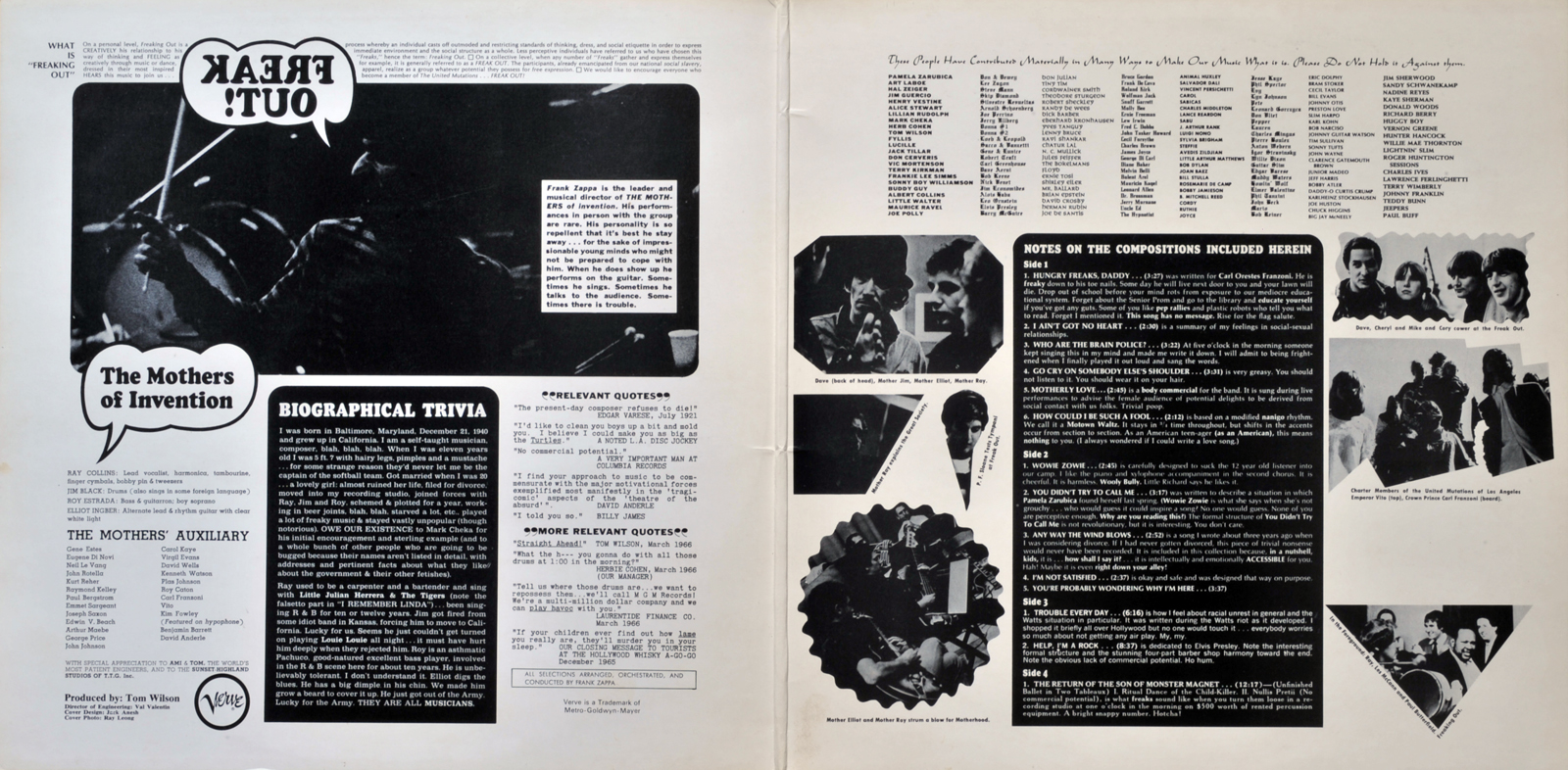 calle_jr Posted October 9, 2010 Author Posted October 9, 2010 Det verkar som om Frank Zappa hade en utstakad plan redan som tonåring, även om han absolut inte hade de sociala eller ekonomiska förutsättningarna för att genomföra vad han ville. Musikmässigt är debutalbumet Freak Out! ett r&b- och bluesinfluerat album. Det är rockens första konceptalbum, men låter både västkust, tidiga Beatles, Animals, Moody Blues, Doors och samtidigt som ett embryo till Frank Zappa and the Mothers i form av orkesterarrangemang och avantgardekollage. Jag tror ingen skulle gissa på det senare om de inte hade hört skivan tidigare. Så kanske det är med Zappas flesta album. Bakgrunden hänger ihop med en egenskap som är gemensam för hela hans produktion och även levnadsstil - satir. Freak Out! är en satir över hela den amerikanska popkulturen, och satir i kombination med en obotlig ikonoklasm döljer sig i texterna, och hela denna debut är en hyllning till galenskap. "Freakdom" är enligt FZ det bästa motgiftet till den amerikanska konsumtionskulturen. Musikaliskt är Freak Out! ett rockalbum, även om det bitvis är snubblande nära avantgarde-jazz eller modern klassisk musik. Dubbelalbum hade man knappt sett tidigare, och detta är det första dubbelalbumet som ett rockband gett ut som debut. I vissa länder, exvis England, gjordes dock en förkortad version som förstautgåva på enkel-LP. Förstautgåvorna i USA kom i stereo och något senare en monoversion. Mothers spelade vita R&B covers på lokala pubar, och att börja spela eget material var en både vågad och tveksam satsning där Zappa mötte stort motstånd, bandmedlemmar lämnade, och spelningarna på lokala pubar och dansställen minskade. Bandet svalt när de anlände till studion; "If Jesse Kay hadn't given us ten dollars, we'd have passed out". FZ lade ner mycket omsorg på skivomslagets design. På samma sätt som folk uppfattar en koppling mellan musiken och hur bandmedlemmarna ser ut, så uppfattar man eller förväntar sig en koppling även till skivomslaget. Det ska ge en ledtråd om vad som finns inuti. Mitt ex är en engelsk press av stereoversionen 2683 004. Uppvikt gatefold (klickbar) De bästa pressarna Amerikanska utgåvor 1966 Verve V6-5005-2. Dubbel-LP stereoversion. Två varianter på konvolut. Den första med en reklamtext på gatefoldens insida om hur man får tag på en karta till "freak-out hot spots" i Los Angeles. Den andra versionen saknade denna reklamtext. 1967 Verve V-5005-2. Dubbel-LP monoversion. Kom i samma två varianter av konvolut som monoversionen. Engelska utgåvor 1966 Verve VLP-9154. Enkel-LP förkortad monoversion. 1966 Verve SVLP-9154. Enkel-LP förkortad stereoversion. 1971 Verve/Polydor 2683 004. Dubbel-LP fullversion återutgåva i stereo sedan Polydor köpt MGM-Verve. 2352 023 och 024 på etiketterna. Quote
