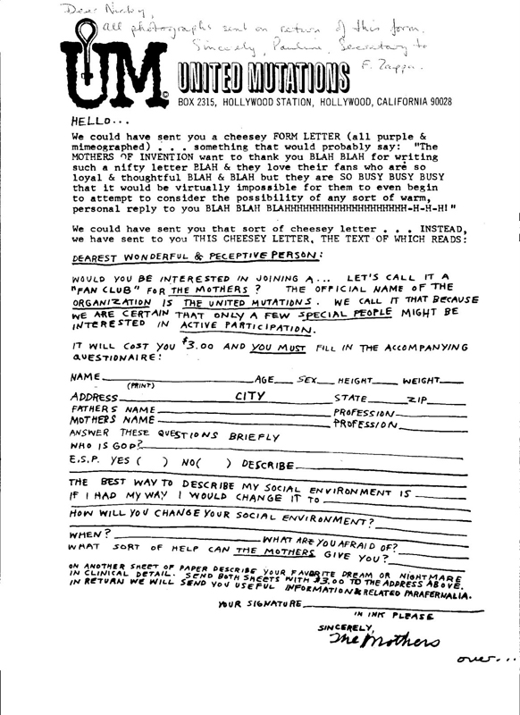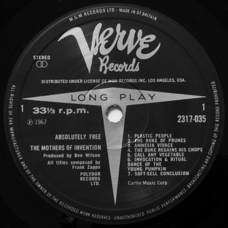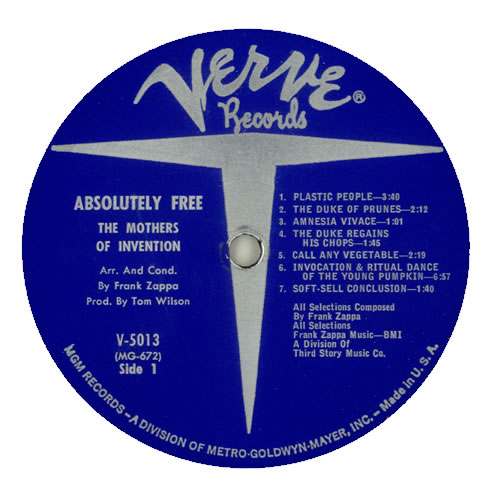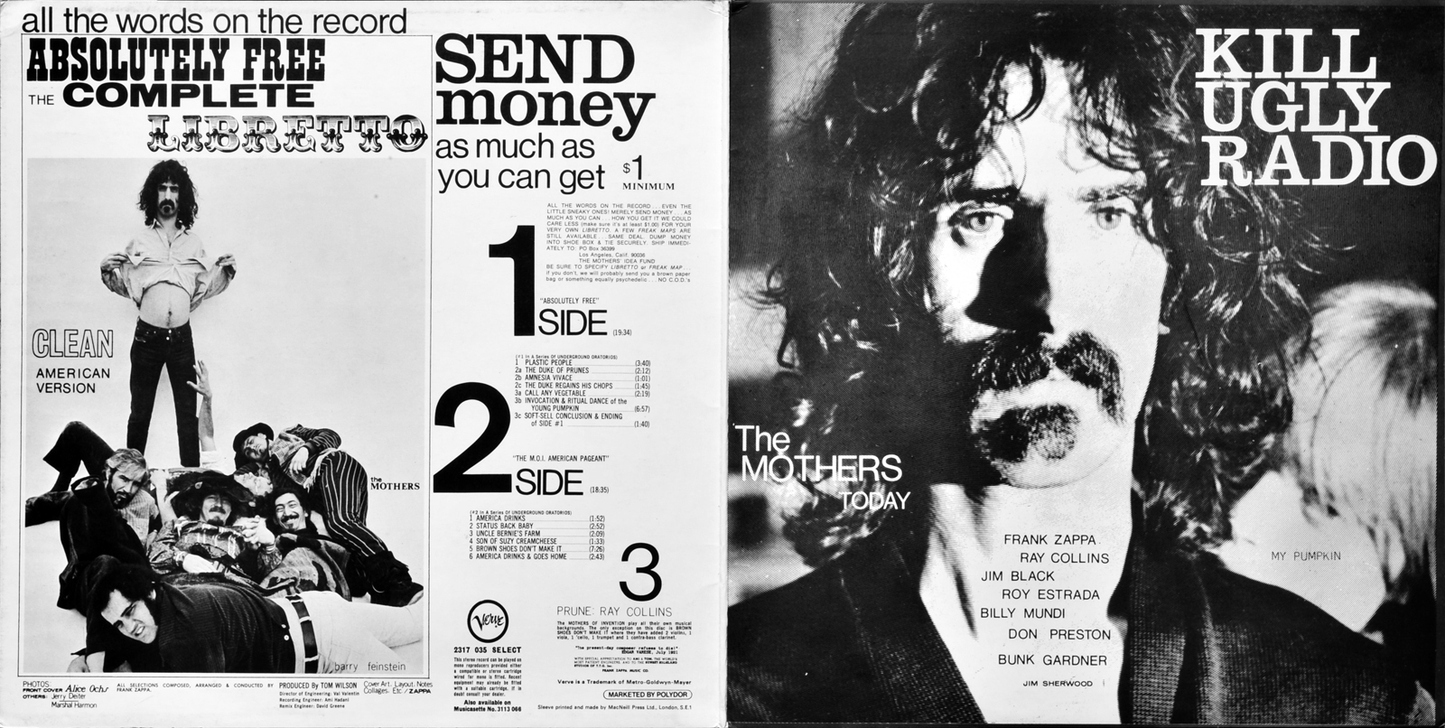 calle_jr Posted October 10, 2010 Author Posted October 10, 2010 Mothers of Invention släppte sitt andra studioalbum Absolutely Free i USA den 26 juni 1967. Stereo- och monoversioner kom ut samtidigt eller ungefär samtidigt i USA och England. MGM satte en tuff budget för Zappa och bandet med ett tak på 11.000 USD. Inspelningsförhållandena var svåra och Zappa hade inte en chans att göra nå'nting riktigt bra. FZ gjorde hela designen till omslaget på ett ruffigt hotellrum i New York. Rummet var så skitigt att han inte kunde hålla originalet rent. Albumet spelades in i november 1966 i Los Angeles på Sunset-Highland Studios under fyra sessioner (ca 25 timmar). Det editerades och mixades på MGM i New York under 5 sessioner (ca 35 timmar). Albumet släpptes sedan inte förrän ett halvår senare, och denna försening verkar helt knäpp med tanke på den stress som föregick för att spela in skivan. Anledningen var bråk mellan bandet och MGM. Skivbolaget ville censurera texterna till en nivå som Zappa inte kunde acceptera. Man inser att Zappa försökte frigöra sig från skivbolag som dikterade villkor. Många andra artister hade säkert inga problem att följa praxis, men för Zappa innebar villkoren rena påhopp på hans grundläggande trosuppfattning. Musiken däremot tog flera år att komponera. Det mesta skrevs före eller precis efter Freak Out!, men en del material är från början av 60-talet. Det var en del av bandet som ändrats under sommaren 1966. Elliott Ingber lämnade för att starta the Fraternity of Man tillsammans med Richie Hayward. Han ersattes under en kort tid av Jim Fielder, innan han började spela med Buffalo Springfield.. FZ var förtjust i slagverk, och det var inte förvånande att han tog in en andra trummis, Billy Mundi, som tidigare spelat med Lamp of Childhood. På Absolutely Free hör vi FZ (gitarr, sång), Ray Collins (sång, tamburin, "prune"), Jim Fielder (gitarr, piano), Don Preston (keyboards), Bunk Gardner (woodwinds), Roy Estrada (bas, sång), Jimmy Carl Black (trummor, sång), Billy Mundi (slagverk) . De andra nya medlemmarna, Don Preston och Bunk Gardner, kom att vara med Mothers ända till slutet. Music has always shown how people think and feel, according to John Tasker Howard. He is probably right. The music of the MOTHERS speaks of the feelings of what might be described as THE VAST MINORITY. The feelings of the people on the fringe of everything ... the ones who don't care if they're IN or OUT ... don't care if they're HIP, HEP, SWINGIN' or ZORCH. This is the audience the MOTHERS want to reach... those few who have the power within themselves to cause or motiviate social change but have never used it for one reason or another. If you are reading this and understand it (even if you have short hair and watch TV 18 hours a day), it is time that you realized WHO and WHAT YOU ARE. It is time you realized what the words to our songs mean. Låtlista Sid 1 "Absolutely Free" (1st in a series of underground oratorios) 1.Plastic People (3:40) 2.The Duke Of Prunes (2:12) 3.Amnesia Vivace (1:01) 4.The Duke Regains His Chops (1:45) 5.Call Any Vegetable (2:19) 6.Invocation & Ritual Dance Of The Young Pumpkin (6:57) 7.Soft-Sell Conclusion (1:40) Sid 2 "The M.O.I. American Pageant" (2nd in a series of underground oratorios) 1.America Drinks (1:52) 2.Status Back Baby (2:52) 3.Uncle Bernie's Farm (2:09) 4.Son Of Suzy Creamcheese (1:33) 5.Brown Shoes Don't Make It (7:26) 6.America Drinks & Goes Home (2:43) Text och musik av Frank Zappa. Frank och "my pumpkin" Gail Zappa. Musikaliskt har Absolutely Free samma riktning som Freak Out! med en blandning av musikgenrer och tydligt samhällskritiska texter. Albumet är mer krävande och på ett sätt mer intressant med svårtillgängliga ljudcollage och märkliga, avantgardistiska rytmer. FZ var nöjd med den extra dimension som Preston och Gardner tillförde jämfört med Freak Out! Med ett åttamannaband fanns möjligheterna att tillföra klassiska element som kännetecknar Absolutely Free. FZ har sagt att det var nu för första gången Stravinkyinfluenserna kunde tillämpas. Albumet inleds med Plastic People, som är baserad på Richard Berry's Louie Louie. Det tog bandet ett år att lära sig spela Call Any Vegetable. Tempostrukturen är fyra takter 4/4, en takt 8/8, en takt 9/8 och därefter 8/8, 9/8, 8/8, 9/8, 8/8, 9/8 och sedan 8/8, 4/8, 5/8, 6/8 och tillbaka till 4/4. Sid 1 är precis som sid 2 en sammanvävd helhet som bättre efterliknar bandets live-framträdanden än enskilda spår. Brown Shoes Don't Make It är huvudnumret i The M.O.I. American Pageant. Öppnings- och avslutningsspåren är versioner av samma spår, med kontrasterande arrangemang. Texten är inspirerad av en händelse med president Lyndon B. Johnson som framstod välklädd i bruna skor och grå kostym, och åkte på oanmäld visit till Vietnam. Uppvikt gatefold (klickbar) Mitt ex är en engelsk press av stereoversionen 2317 035. De bästa pressarna Amerikanska utgåvor 1967 Verve V-5013. Monoversion. Gatefold med blå-silver etikett. 1967 Verve V6-5013. Stereoversion. Gatefold med blå-silver etikett. Engelska utgåvor 1967 Verve VLP-9174. Monoversion. Hade en dikt av Mike Raven på konvolutets baksida som inte fanns med på några andra utgåvor än denna och SVLP-9174. 1967 Verve SVLP-9174. Stereoversion. 1972 Verve/Polydor 2317 035. Återutgåva i stereo, gatefold. Mothers' fan club var United Mutations. Den som skickade in 3 USD fick ett medlems-kit med foton och biografier av bandmedlemmarna, ett medlemskort, kopior av den amerikanska konstitutionen och de första tio tilläggen (Bill of Rights). För att bli medlem skulle man också svara på några frågor, såsom: Vem är Gud? Hur skall du ändra din sociala miljö? När? Vad är du rädd för? Hur kan Mothers hjälpa dig? Quote