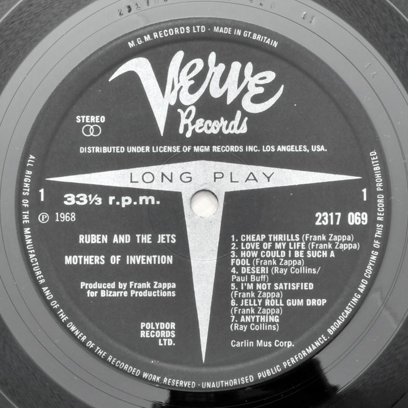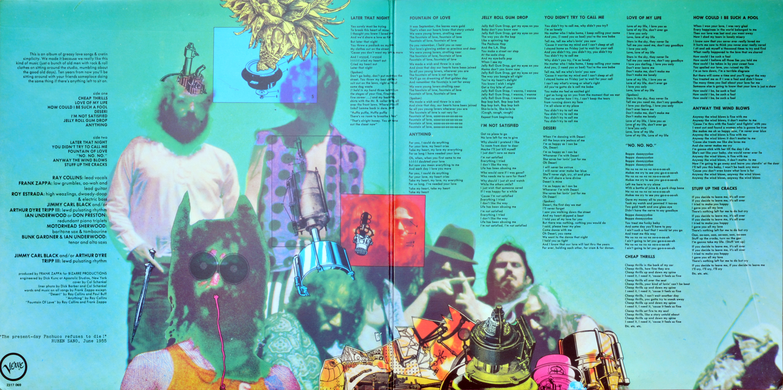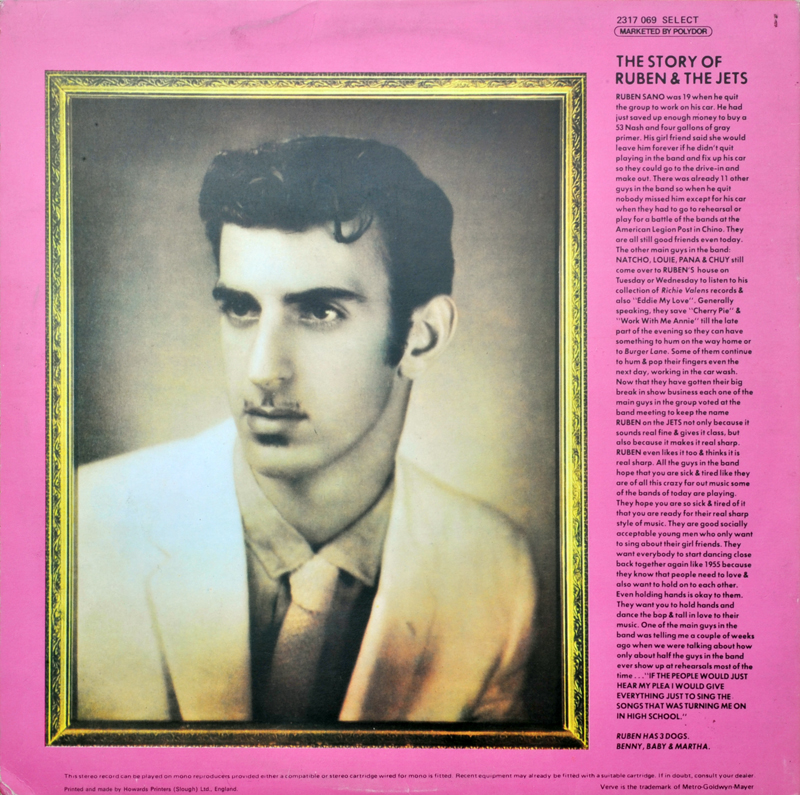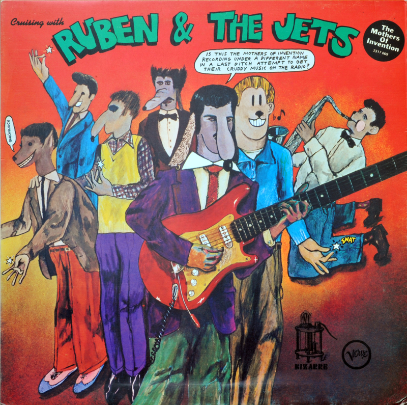calle_jr Posted November 4, 2010 Author Posted November 4, 2010 Cruising With Ruben & The Jets låter missledande enkel med banala texter och utan de komplexa Zappa-arrangemang vi vant oss vid. Han har dock själv framställt att det faktiskt är en muterad version av Stravinskys neo-klassiska period. Han efterliknar egentligen både det musikaliska temat och den idé Stravinsky själv tillämpade genom att ta normer och traditioner från den klassiska perioden och uppföra den i en egen, modern stil. Cruising With Ruben & The Jets släpptes i december 1968, och nu har Zappa med sig Mothers of Invention igen. Albumet har beskrivits som en kollision mellan hög och låg konst. Ackordväxlingar och ovanliga tempon mixas med avsiktligt banal tonårspop. kombinerar med inledningen av Våroffer. Låten är full av idiotiska sångklyschor som är noggrant utvalda för att matcha ett nostalgist tema. Som vanligt, eller ännu mer än vanligt, med en stor portion ironi. Zappa och Mothers växte upp med doo-wop-musiken. Jag vet inte om man ska kalla detta album en parodi eller om det är en hyllning till doo-wop-genren. Vi hör mer medförfattande från Mothers på detta album än tidigare, speciellt Ray Collins som hade sin bakgrund i doo-wop. Han medverkade i The Soul Giants med Roy Estrada och Jimmy Carl Black. Det var Ray Collins som tog in Zappa när Soul Giants gitarrist hade lämnat bandet. The Soul Giants är ursprunget till The Mothers. Mothers på detta album är Jimmy Carl Black (trummor), Ray Collins (sång), Roy Estrada (bas, sång), Bunk Gardner (tenor- & altsax), Don Preston (keyboards), Motorhead Sherwood (baritonsax, tamburin), Arthur Dyer Tripp III (trummor) och Ian Underwood (keyboards, tenor- & altsax). Text på konvolutets baksida; RUBEN SANO was 19 when he quit the group to work on his car. He had just saved up enough money to buy a 53 Nash and four gallons of gray primer. His girl friend said she would leave him forever if he didn't quit playing in the band and fix up his car so they could go to the drive-in and make out. There was already 11 other guys in the band so when he quit nobody missed him except for his car when they had to go to rehearsal or play for a battle of the bands at the American Legion Post in Chino. They are all still good friends even today. The other main guys in the band: NATCHO, LOUIE, PANA & CHUY still come over to RUBEN'S house on Tuesday or Wednesday to listen to his collection of Richie Valens records & also "Eddie My Love". Generally speaking, they save "Cherry Pie" & "Work With Me Annie" till the late part of the evening so they can have something to hum on the way home or to Burger Lane. Some of them continue to hum & pop their fingers even the next day, working in the car wash. Now that they have gotten their big break in show business each one of the main guys in the group voted at the band meeting to keep the name RUBEN on the JETS not only because it sounds real fine & gives it class, but also because it makes it real sharp. RUBEN even likes it too & thinks it is real sharp. All the guys in the band hope that you are sick & tired like they are of all this crazy far out music some of the bands of today are playing. They hope you are so sick & tired of it that you are ready for their real sharp style of music. They are good socially acceptable young men who only want to sing about their girl friends. They want everybody to start dancing close back together again like 1955 because they know that people need to love & also want to hold on to each other. Even holding hands is okay for them. They want you to hold hands and dance the bop & fall in love to their music. One of the main guys in the band was telling me a couple of weeks ago when we were talking about how only only about half the guys in the band ever show up at rehearsals most of the time ... "IF THE PEOPLE WOULD JUST HEAR MY PLEA I WOULD GIVE EVERYTHING JUST TO SING THE SONGS THAT WAS TURNING ME ON IN HIGH SCHOOL." SOON! CHAPTER TWO & OTHER INTIMATELY REVEALING REVELATIONS! RUBEN HAS 3 DOGS. BENNY, BABY & MARTHA. How to comb and set a jellyroll. Låtlista Sid 1 1. Cheap Thrills – 2:20 2. Love of My Life (Zappa, Collins) – 3:17 3. How Could I Be Such a Fool – 3:33 4. Deseri (Buff, Collins) – 2:04 5. I'm Not Satisfied – 3:59 6. Jelly Roll Gum Drop – 2:17 7. Anything (Collins) – 3:00 Sid 2 1. Later That Night – 3:04 2. You Didn't Try to Call Me – 3:53 3. Fountain of Love (Zappa, Collins) – 2:57 4. No. No. No.– 2:27 5. Anyway The Wind Blows – 2:56 6. Stuff Up The Cracks – 4:29 Text och musik av Frank Zappa om ej annat anges. Albumet kan lyssnas rakt igenom närhelst man är på doo-wop-humör Exempel på spår är , och Stuff Up The Cracks. En kort tid efter att Cruising With Ruben & The Jets kommit ut vintern 1968 blev det en 50-tals doo-wop-våg i USA med Chuck Berry, Elvis Presley och nya grupper som Sha-Na-Na. Fem år efter release kontaktade Ruben Guevara och hans "riktiga" doo-wop-band Frank Zappa för att be om tillstånd att använda namnet "Ruben & The Jets" för sitt band. Zappa gillade detta skarpt, och gav inte bara tillstånd utan erbjöd sig även att producera deras första LP som gavs namnet "For Real!"; Zappa var länge missnöjd med ljudet på originalmixen på Cruising With Ruben & The Jets, och albumet mixades om 1984 med nyinspelning av bas och trummor. Åtskilliga ändringar gjordes även av sångpåläggen, och detta var en kontroversiell återutgåva som inte gillades av merparten Zappa-fans, och många har kallat återutgåvan ett helt nytt album. As a composer and performer, he's amazingly proficient. As a creative person, I know he has all the qualifications. As my brother, he's really a mother. Mitt ex är en engelsk press av stereoversionen 2317 069. Uppvikt gatefold (klickbar) Omslagsdesign av Cal Schenkel De bästa pressarna Amerikanska utgåvor 1968 Verve V6-5055. Stereoversion. Gatefold med blå-silver etikett. Ett fåtal av de 