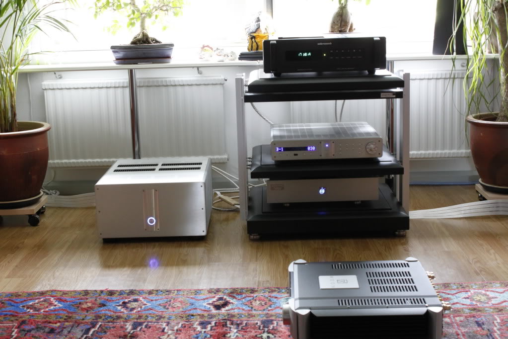 stargazer Posted June 7, 2011 Author Posted June 7, 2011 Här är en bild på hela riggen. Som synes är det för- och slutsteg från Ayre acoustics som driver härligheten, matad av en diskspinnare från Bladelius. Kablage från Nordost. Quote