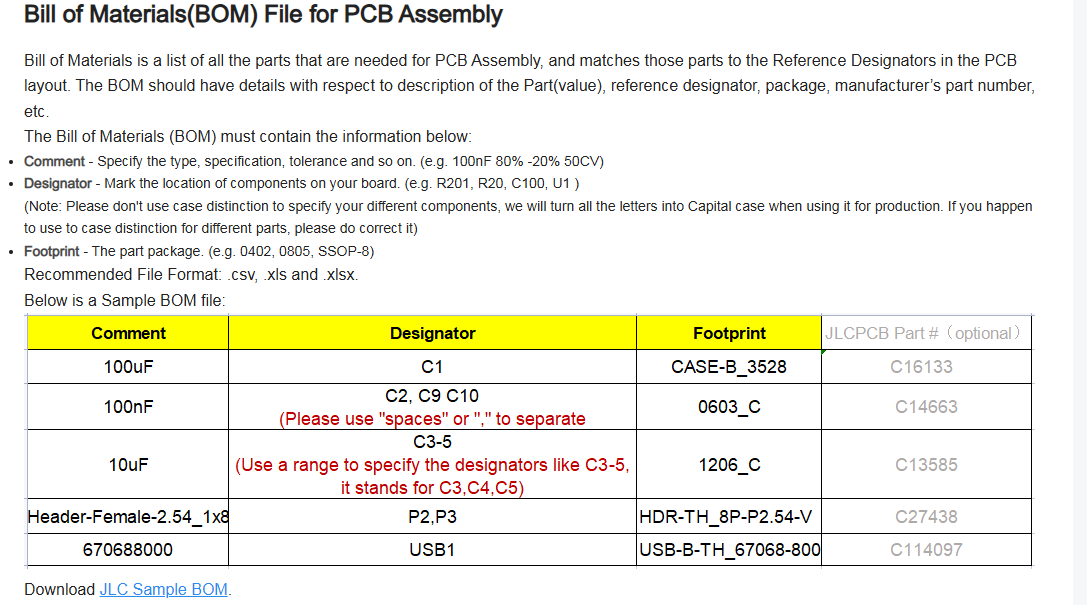 Specialgrejjer har de ofta inte. Jag brukar göra ordning bom, pnp filer via mitt vanliga verktyg. Sen konverterar jag dem till JLCPCB's format med typ chatgpt. Sen går jag igenom det som jag vill ha monterat. Jag brukar leta upp lämpliga komponenter från https://www.lcsc.com/ . Deras partnummer du vill använda petar du in i BOM-kolumnen till höger. JLCPCB kan inte köpa in allt från https://www.lcsc.com/ utan du får varningar när du sen försöker ladda upp bom:en, och får då välja nya. Hittar du inget lämnar du fältet tomt. En begränsning är att de måste köpa in ett minimumantal av vissa komponenter så det lönar sig mest om du ska göra mer än ett kort.