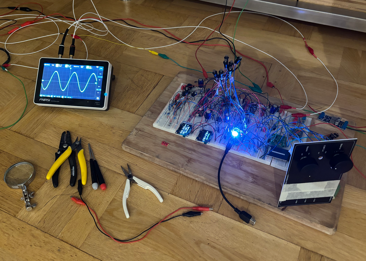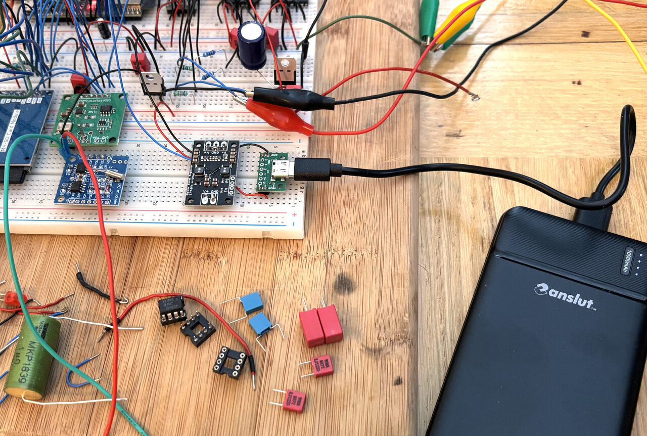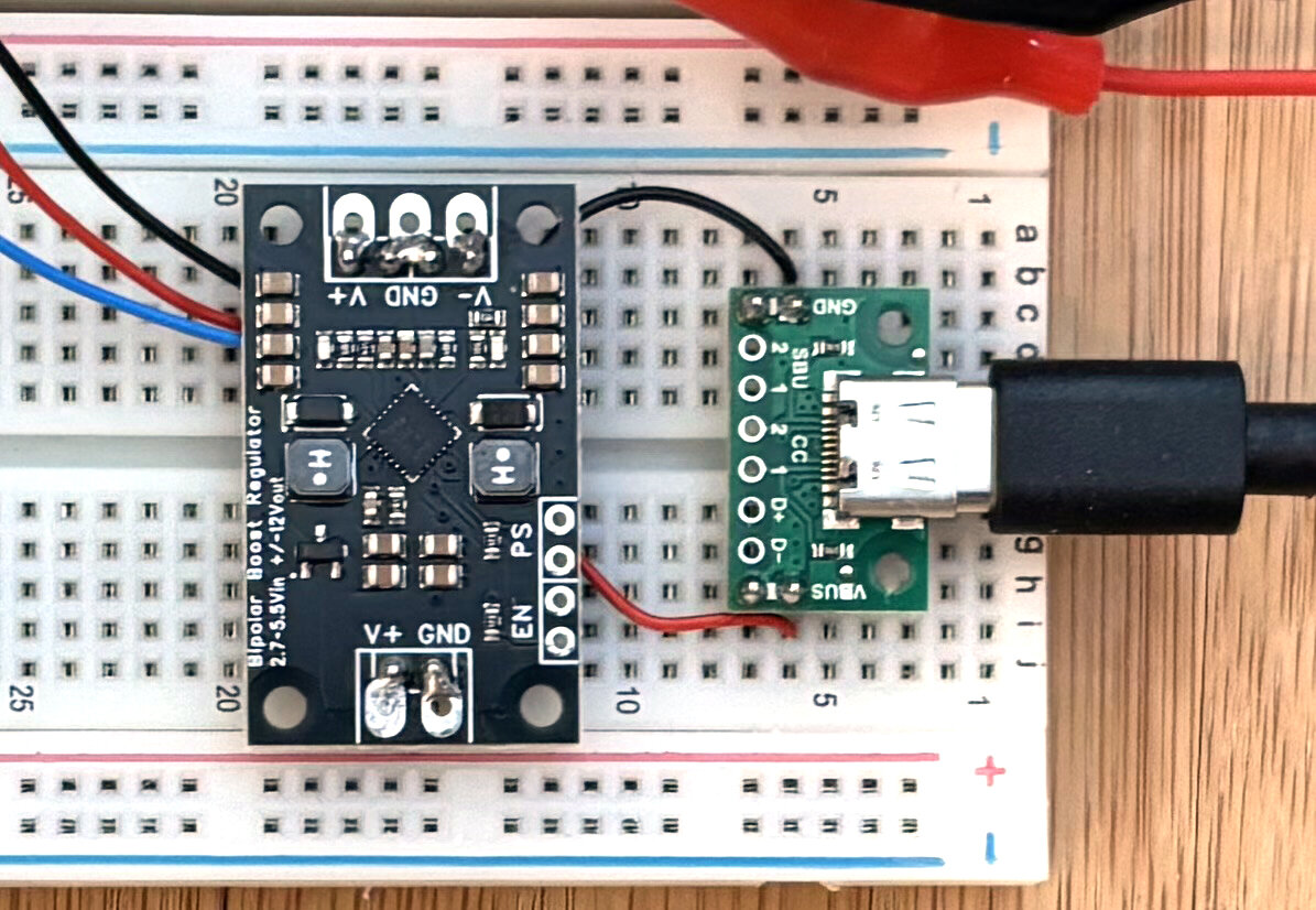 Spänningsmatning sker med en 5V powerbank usb-c, och en dc-dc stepup med switchad spänningsregulator omvandlar till +/-12VDC.