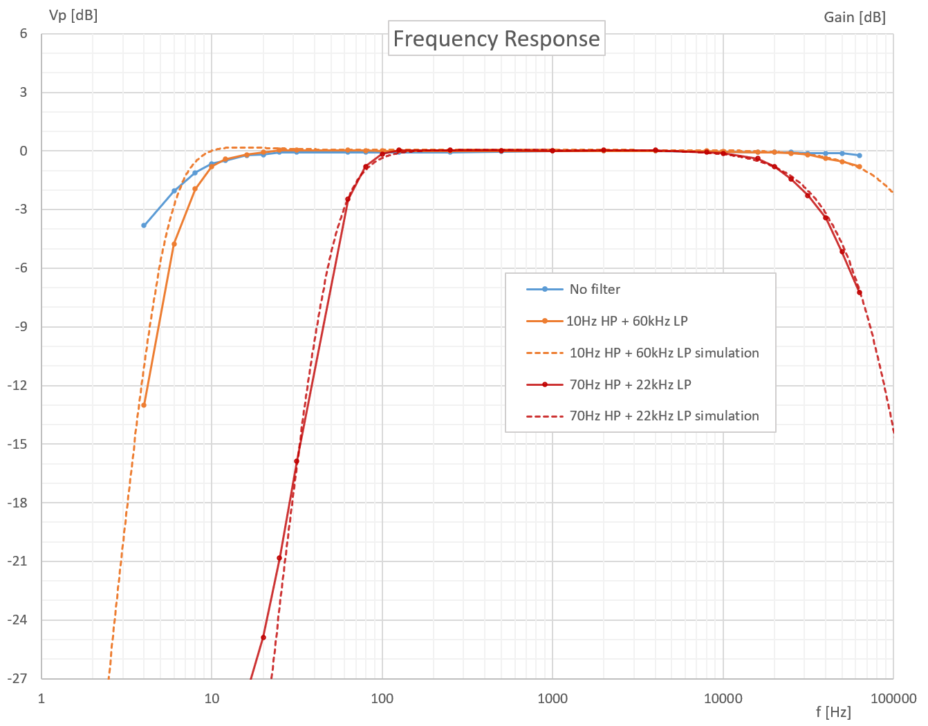 Kalibrering av filter jämfört med simulering: Vi behöver en del RC-filter på olika ställen både på analog- och digitalkortet för att eliminera dc mellan de olika delkretsarna. Jag har inte med dessa i simuleringen vilket förklarar den lilla avvikelsen för 10Hz HP-filtret (orange i diagrammet). Grundtanken är att 10Hz + 60kHz är det filter som används generellt för mätningar. 70Hz + 22kHz är utformat för de flesta mätningar på pickuper och tonhuvuden där man normalt bara använder 100Hz, 1kHz och 10kHz. Pga filtrens branthet kommer det bli fasvridningar i närheten av delningarna. Det gör att fasgången kommer variera en hel del även i närheten av delningarna. Vi har därför valt snäva toleranser för kondensatorerna i filtren, även om +/-10% avvikelse inte ger några betydande fel mellan kanalerna (<1us vid 10kHz). Test av håltagning i frontpanel: