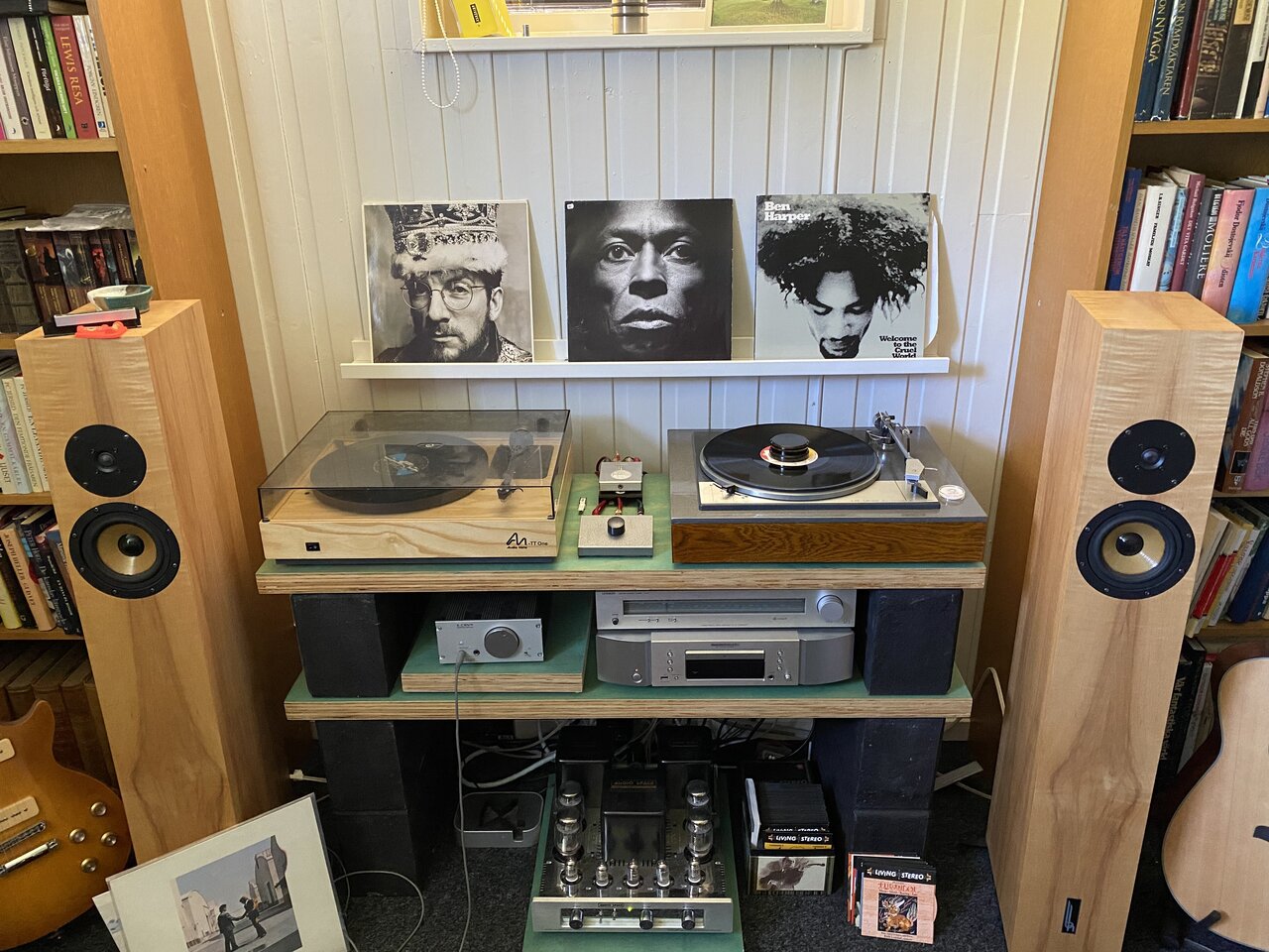 Det var nu några år sedan. Det som hänt är främst att mina Totem fått ge plats för Blumenhofer fun 13, som ger ett i alla delar bättre ljud i mitt rum. Mycket nöjd. CDn från Marantz dog och fick ersättas av ny likadan i 6000-serien. Kanske inte någon gigantisk förbättring, men den gör det den ska. Största och senaste ”tilltaget” är väl att jag blivit med Lenco. Fantastiskt kul detta med en skivspelare som man mekar med två skruvmejslar, en skiftnyckel och en gummiklubba. 😁 att renovera och bygga ny plint till denna är nog det roligaste jag gjort! Sedan låter det bra också. Har nu två spelare för lite olika känslostämningar. Skaffade mig ett extra pu-skal också, så nu har jag en AT och en Shure att växla mellan.